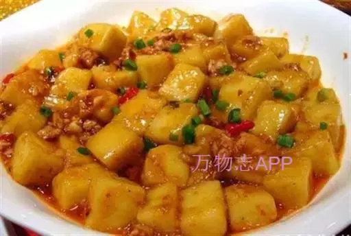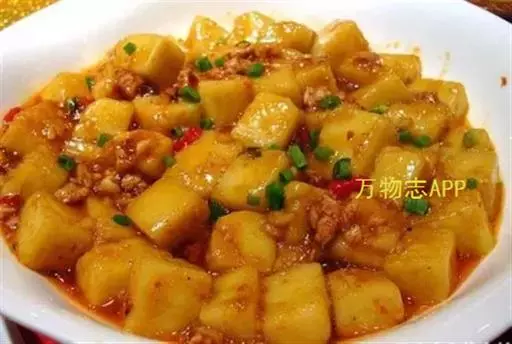制作工艺:传统的米豆腐制作是将阆中本地的大米加水浸泡发胀后,用石磨磨成米浆,用温火搅煮成糊团。起锅后,手沾碱水拍成小圆柱或切成方块,上笼蒸熟即可。