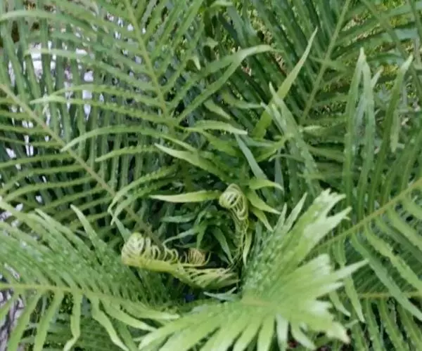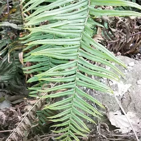叶簇生;柄坚硬,长10-30厘米或更长,基部粗3-4毫米,深禾秆色至浅褐色,幼时密被与根状茎上同样的鳞片,以后渐变稀疏;叶片倒披针状长圆形,长20-90厘米或更长,宽5-25厘米或更宽,一回羽状;顶生羽片与侧生羽片同形,侧生羽多数(可达40对),互生或有时近对生,下部羽片较疏离,相距3-4厘米,斜展,无柄,不与叶轴合生,向下羽片逐渐缩短,基部羽片仅为耳形,中部羽片最长,狭线形,长6-15厘米宽5-10毫米,先端渐尖,基部扩大并为浅心脏形,其两侧稍呈耳形,上侧耳片较大并常覆盖叶轴,各羽片间的间隔宽约1-1.5厘米,不育的叶缘有微细而均匀的密锯齿,不为软骨质。主脉下面隆起并为浅禾秆色,侧脉纤细,密接,斜展,单一或分叉。叶干后薄革质,暗绿色,无光泽,无毛;叶轴禾秆色,疏被鳞片。在成熟的植株上除下部缩短的羽片不育外,几乎全部羽片均能育。