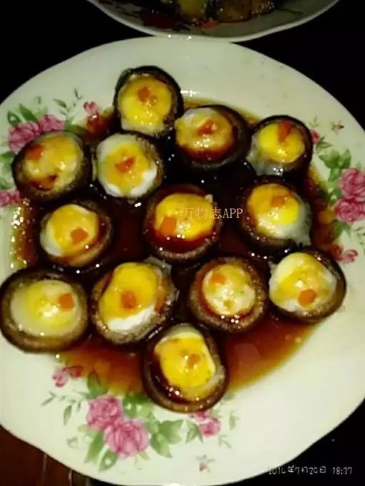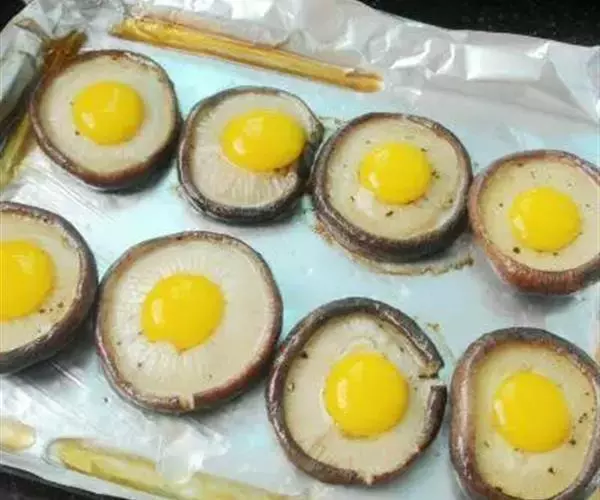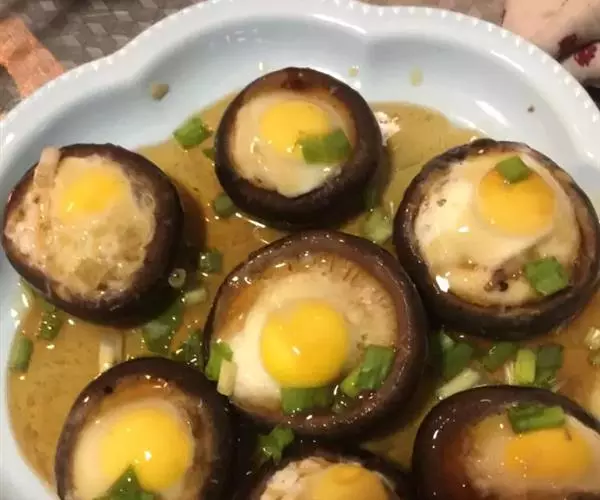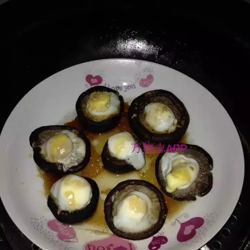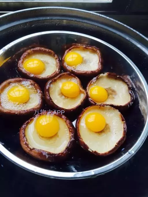 2、然后将鹌鹑蛋打到香菇盖中,装盘待用;将装盘的香菇鹌鹑蛋放入蒸锅中,大火烧开,然后转小火蒸10分钟;