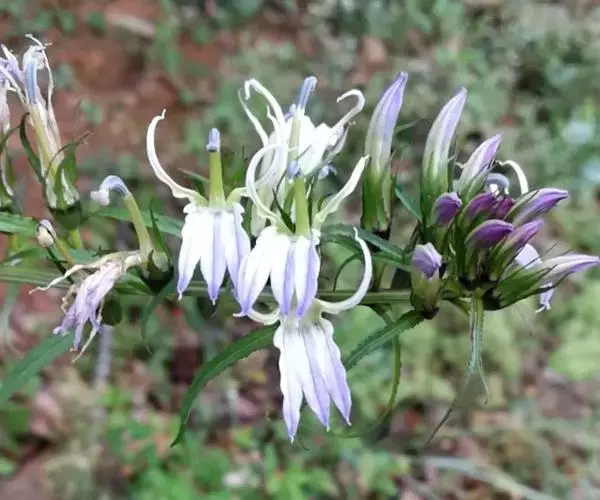 药材性状:根茎较粗壮,具多数白色细须根。茎直立。单叶互生,披针形,先端尖,边缘具细锯齿。总状花序生茎顶端,花萼钟状5裂;花冠深蓝色,近二唇形,上唇2全裂,下唇3裂,裂片长圆形,边缘密生白色缘毛。有时可见小蒴果。气微,味微苦。