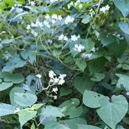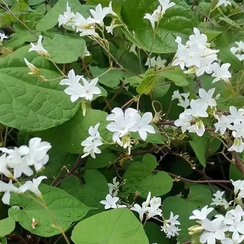 描述: 攀援灌木,茎缠绕,小枝近圆柱形,短,极无毛。叶宽卵状心形,长6-8厘米,宽4.5-6厘米,先端渐尖或骤渐尖,基部深心形,两面无毛,背面苍白色,基出脉7,侧脉1-2对,侧脉及网脉密生小瘤点;叶柄纤细,较叶片短2倍,长3-4厘米,无毛,具槽。苞叶,极小或逐渐缩小,长4-2厘米,宽25-10毫米,与叶同形,柄长20-3毫米。花序腋生,为总状花序或圆锥花序,总梗细,无毛,具白色小瘤点;花梗纤细,长1-2厘米,顶端或近顶端具2-3小苞片,基部具苞片,小苞片较萼片小2-3倍,狭,长0.5-1.5毫米;萼片线形,锐尖,近等长,长3-4毫米,背面极无毛,果熟时3个极增大,长圆形,先端钝且具小尖头,带紫色,长2.5-3厘米,宽1.3厘米,干膜质,具8-9条纵贯的脉,及具细网脉,两面均明显。花冠狭漏斗形,长25-30毫米,白色,先端骤然开展,冠檐浅裂,裂片圆形,顶端微缺,具小短尖头;雄蕊着生于花冠管中下部,3列,花丝近于无,长1-2毫米,既不扩大,也不具乳突;花药长圆状心形,长约2毫米;子房球状,无毛,1室,2胚珠;花柱短,长2-5毫米,柱头棒状,长约0.6毫米。蒴果球形,紫红色。种子1。