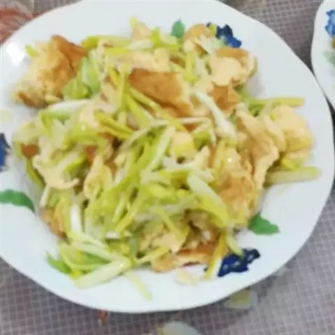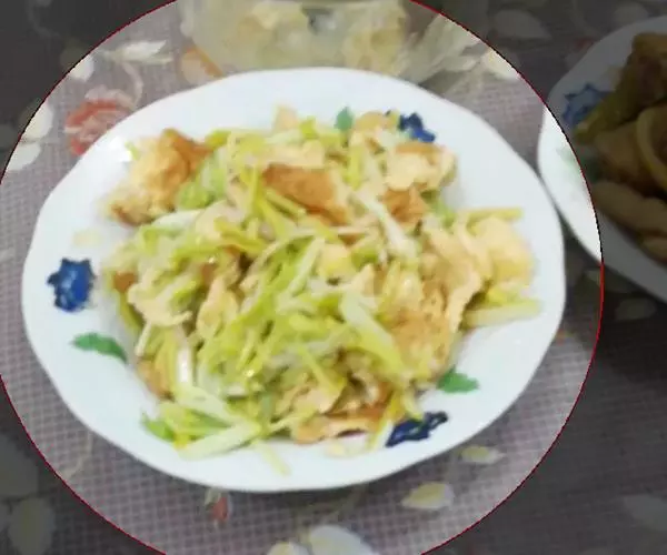 1. 将蛋打入碗内,放盐少许打散,下锅煎成薄蛋皮,切条;