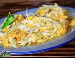 主料:鸡蛋150克,韭黄150克 韭黄炒蛋 调料:花生油50克,盐3克,白砂糖5克