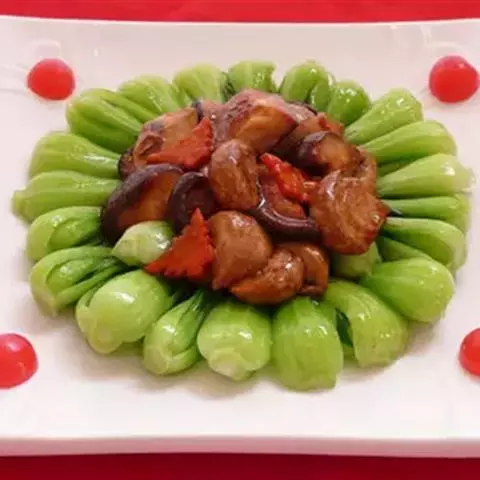 原料:广东菜心300克、红椒1~2个(装饰用)、葱。