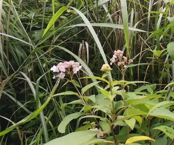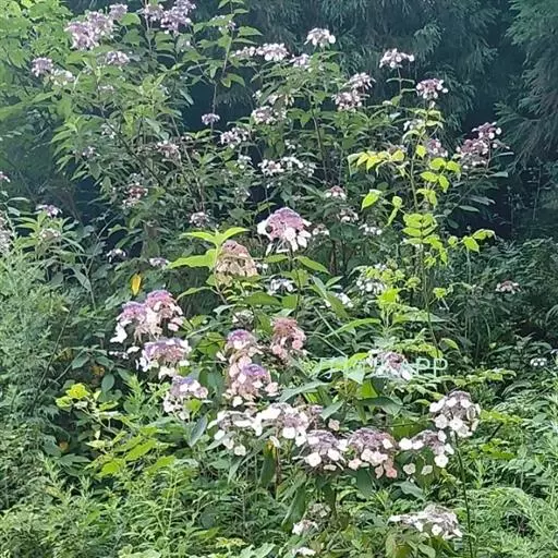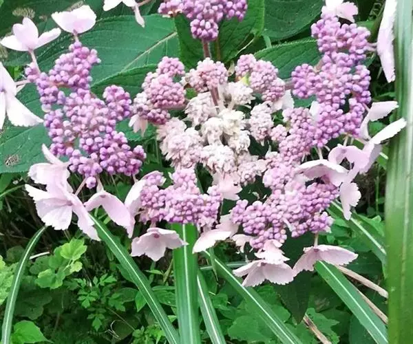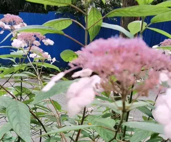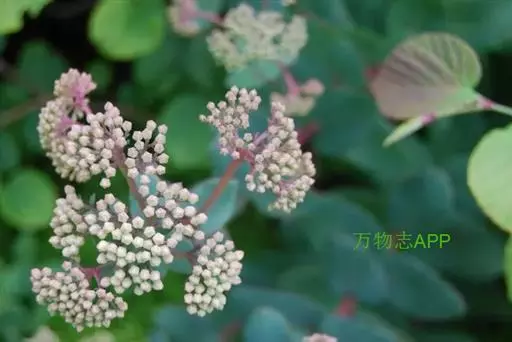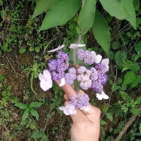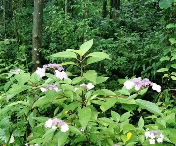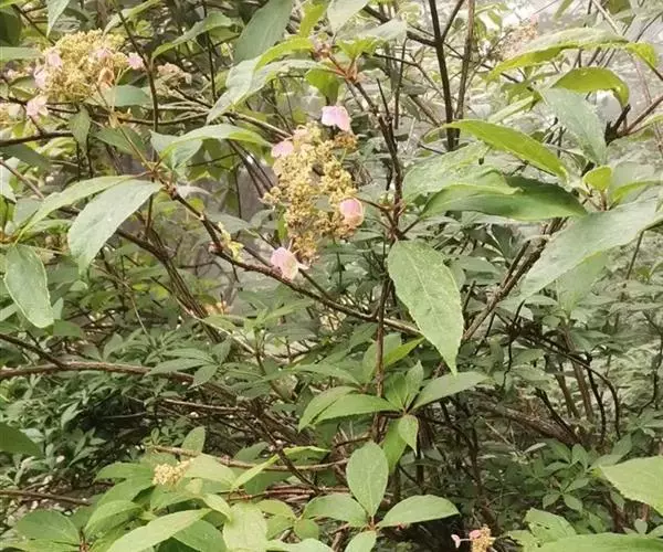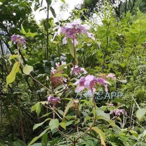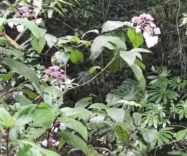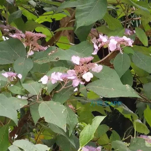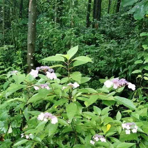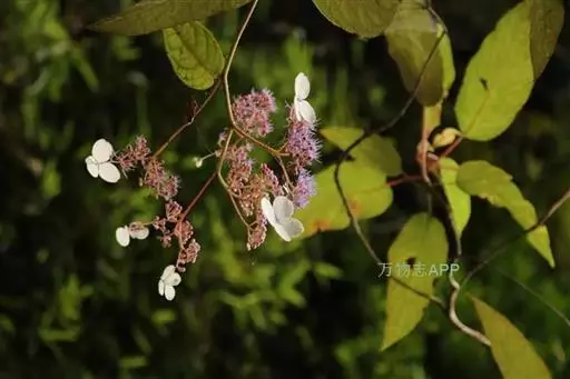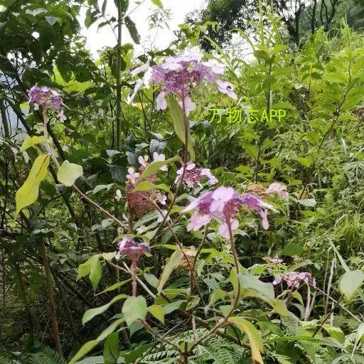 伞房状聚伞花序大,直径达28厘米,顶端稍拱,分枝扩展,密被灰白色糙伏毛;不育花萼片4-5,阔卵形、阔椭圆形或近圆形,结果时长1.3-2.7厘米,宽1.1-2.5厘米,先端钝头渐尖或近截平,基部具爪,边全缘或具数齿,白色或淡紫红色;孕性花淡紫红色,萼筒钟状,长约2毫米,萼齿三角形,长约0.5毫米;花瓣长卵形,长2-2.5毫米,初时顶端稍连合,后分离,早落;雄蕊不等长,较长的长约6毫米,较短的长约3毫米,花药长圆形,长约0.5毫米;子房下位,花柱2,结果时长约2毫米,近棒状,直立或外弯。