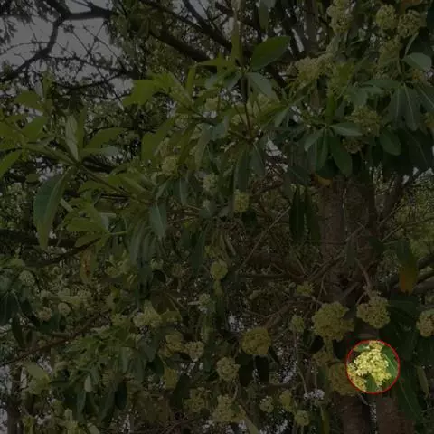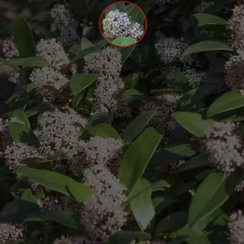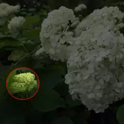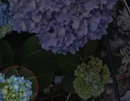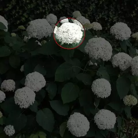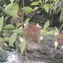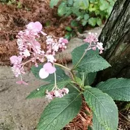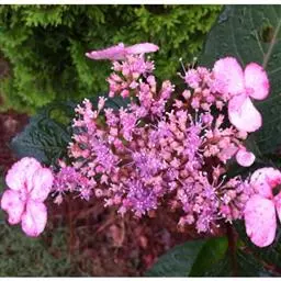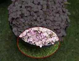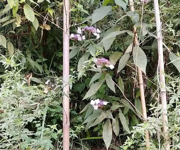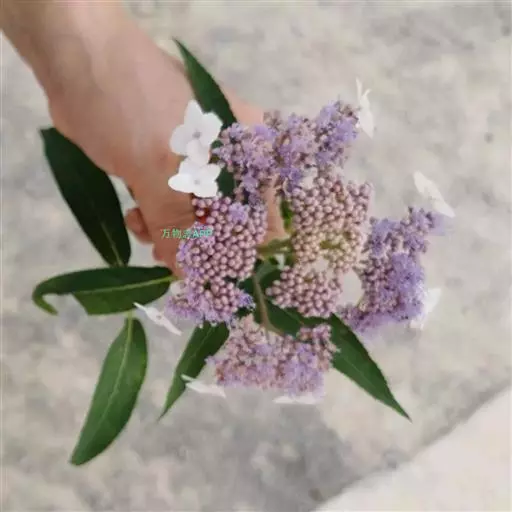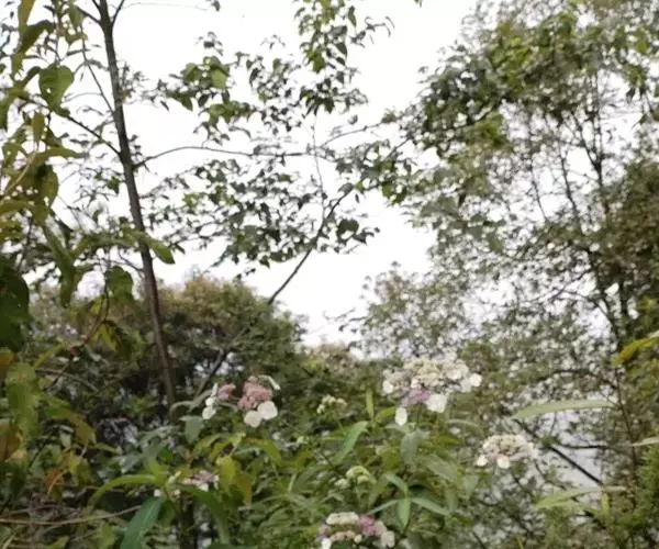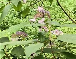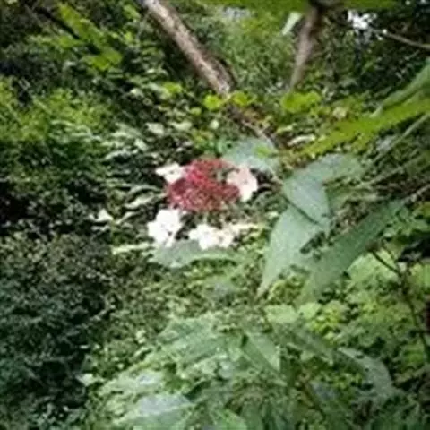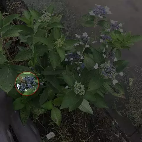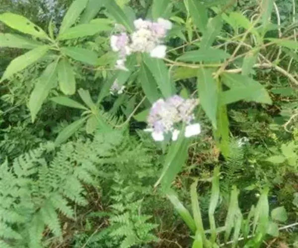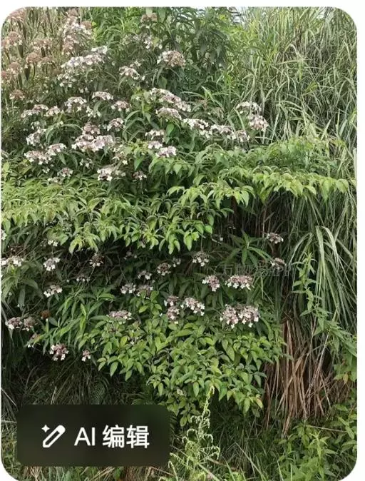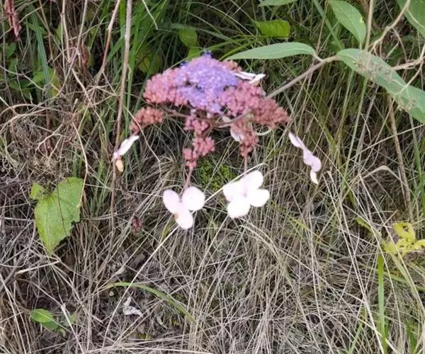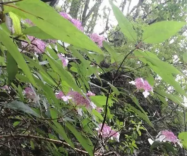 伞房状聚伞花序大,直径达28厘米,顶端稍拱,分枝扩展,密被灰白色糙伏毛;不育花萼片4-5,阔卵形、阔椭圆形或近圆形,结果时长1.3-2.7厘米,宽1.1-2.5厘米,先端钝头渐尖或近截平,基部具爪,边全缘或具数齿,白色或淡紫红色;孕性花淡紫红色,萼筒钟状,长约2毫米,萼齿三角形,长约0.5毫米;花瓣长卵形,长2-2.5毫米,初时顶端稍连合,后分离,早落;雄蕊不等长,较长的长约6毫米,较短的长约3毫米,花药长圆形,长约0.5毫米;子房下位,花柱2,结果时长约2毫米,近棒状,直立或外弯。