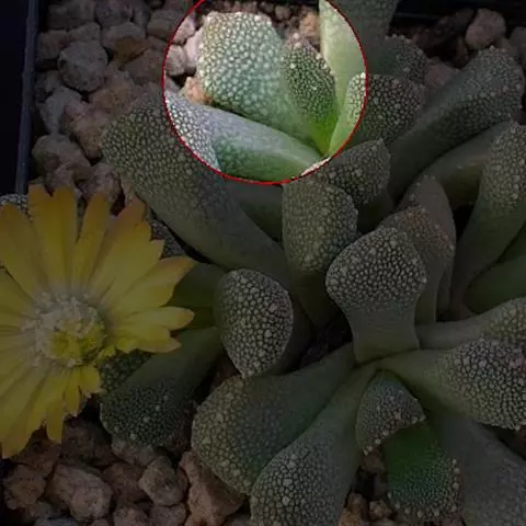 荒玉为番杏科生石花属,原产南非。株体呈白粉色,表面布满凹凸纹路,凹陷处为红褐色,每年秋季开黄花。