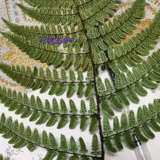陆生中型蕨植物。 株高约50-80厘米。根状茎横卧或斜升,顶端及叶柄基部密被披针形、棕色、全缘的鳞片。叶簇生;叶柄长约30-40厘米,粗达4-5毫米,禾秆色,密被鳞片;鳞片阔披针形,顶端渐尖,边缘有尖齿;叶片卵状披针形,长约40-60厘米,宽约20-30厘米,二回羽状,小羽片羽状浅裂或深裂;羽片约10-15对,基部的近对生,上部互生,卵状披针形,基部略收缩,顶端斜向叶尖,小羽片约10-13对,披针形,长约2-3厘米,基部浅心形至阔楔形,具短柄,顶端钝圆并具细尖齿,边缘羽状浅裂至羽状深裂,基部一对裂片明显最大而使小羽片基部最宽;裂片圆钝头,顶端具尖齿。侧脉羽状,在叶片下面明显可见。叶轴密被基部阔披针形,顶端毛状渐尖,边缘有细齿的棕色鳞片,羽轴具有较密的泡状鳞片。叶草质,干后褐绿色,孢子囊群大,在小羽片中脉两侧或裂片两侧各一行,位于中脉与边缘之间或略靠近边缘着生;囊群盖圆肾形,全缘。