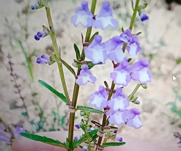 花单生于茎或分枝上部叶腋内,具花的茎部长4~11厘米;苞叶下部者似叶,但较小,长达8毫米,上部者更变小,长2~4.5毫米,椭圆形至长椭圆形,全缘,上面散布下面沿脉疏被小毛;花梗长1~2毫米,被微柔毛,中部有一对长约0.5毫米具纤毛的针状小苞片。花萼开花时长约2毫米,外面沿脉被微柔毛,边缘具短缘毛,盾片高约1毫米,果时花萼长4.5毫米,盾片高2毫米。花冠紫蓝色,长9~13毫米,外被短柔毛,内在喉部疏被疏柔毛;冠筒基部囊大,宽1.5毫米,向上渐宽,至喉部宽达3.5毫米;冠檐2唇形,上唇盔状,半圆形,长1.5毫米,先端圆,下唇中裂片梯形,全缘,长2.5毫米,宽4毫米,2侧裂片三角状卵圆形,宽1.5毫米,先端急尖。雄蕊4,前对较长,微露出,具能育半药,退化半药不明显,后对较短,内藏,具全药,药室裂口具髯毛;花丝扁平,前对内侧后对两侧下部被小疏柔毛。花柱细长,先端锐尖,微裂。花盘盘状,前方隆起,后方延伸成短子房柄。子房4裂,裂片等大。