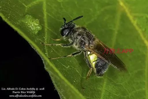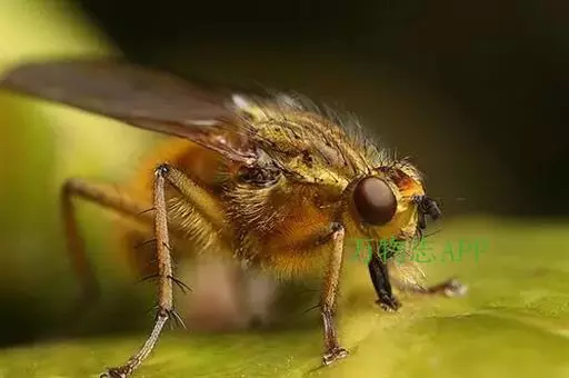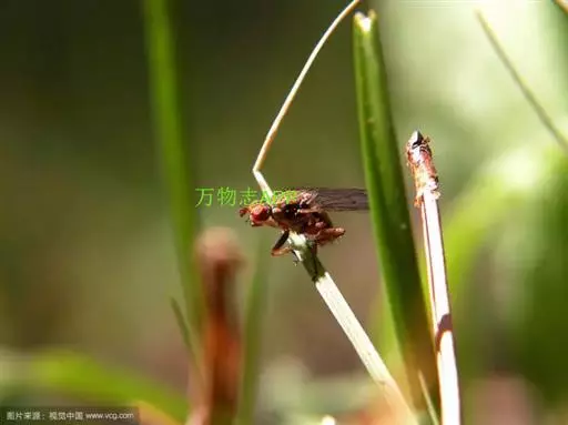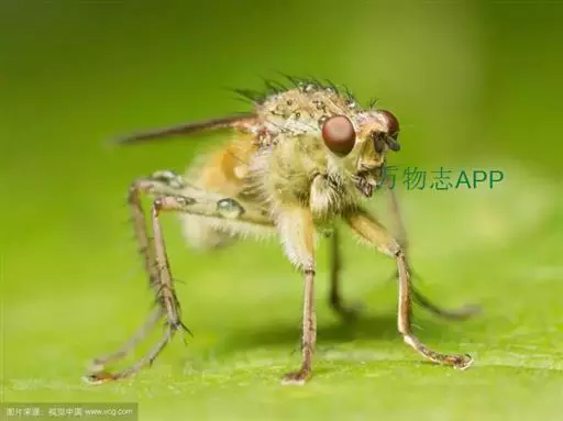 昆虫,形状像蝇而略大,体黑绿色,雄的吸植物的汁液,雌的吸人畜的血液。