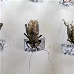 牛虻虫 一、种虻来源:一般初养者以捕捉野生虻为主, 虻的活动季节依地区及种类的不同而异。中国南方地区一般为4~10月份,北方地区为5~8月份。但以6~8月份最多,成虻(雌)吸血,喜在强烈阳光下, 以中午为最活跃,雄虻不吸血,以吸取植物的汁液生活,生活在草丛及树林中,捕捉时, 用事先做好的扣网到草场上的牛马群中进行捕捉(雌), 雄虻可到牛马群附近的草丛及树林中捕捉,之后收集, 虻的雌雄可通过复眼来签别:雄虻的复眼为接眼式,即两眼在中缘相接触,雌虻为高眼式,两眼间有明显的距离。