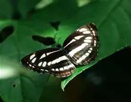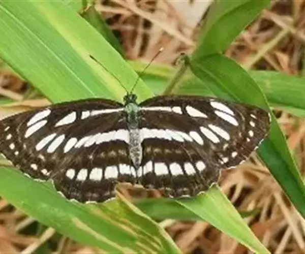 中环蛱蝶 翅展40.0~50.0 mm。体背面黑色,腹面苍黄色。触角顶端黄色。翅表面黑褐色,斑纹白色,外缘波状并有白色缘毛;翅展开时显示3列由大小斑纹组成并两翅相连的白色带。前翅中室内有一条长形纵带,其前方有一个箭头状斑纹。翅下表面黄色或黄褐色,斑纹清晰,周缘有明显的黑线围绕。
