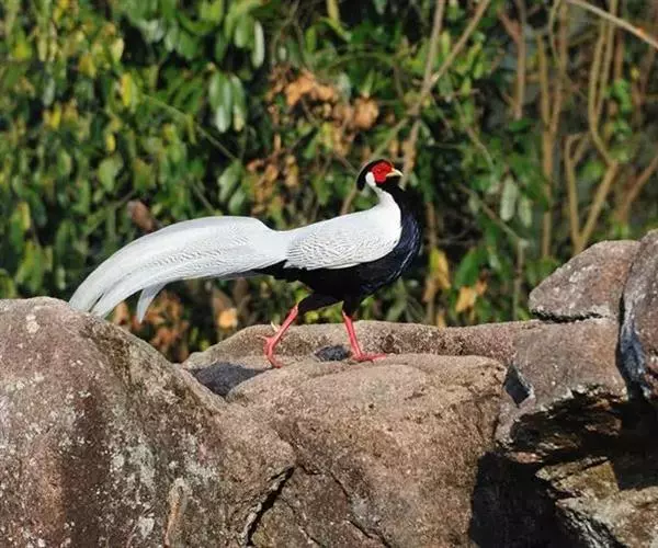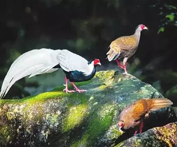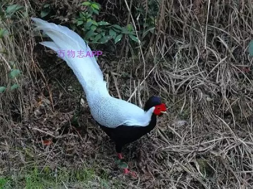 白鹇(学名:Lophura nycthemera):国家二级保护动物,属于大型鸡类。雄鸟全长100-119厘米,雌鸟58-67厘米。头顶具冠。嘴粗短而强壮,上嘴先端微向下曲,但不具钩;鼻孔不为羽毛所掩盖着。翅稍短圆。尾长。跗蹠裸出,雄性具距,但有时雌雄均有;趾完全裸出,后趾位置较高于他趾。雌雄异色;雄鸟上体白色而密布以黑纹,头上具长而厚密、状如发丝的蓝黑色羽冠披于头后;脸裸露,赤红色;尾长、白色,两翅亦为白色。下体蓝黑色,脚红色。雌鸟通体橄榄褐色,羽冠近黑色。