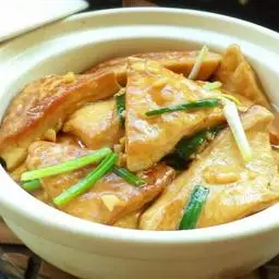 先在热锅里调酱汁,再倒入已经煎炸过的豆腐和蔬菜,这样出锅时豆腐的口感很香脆。