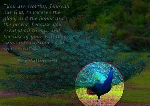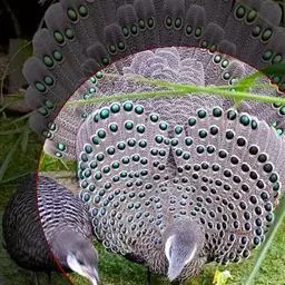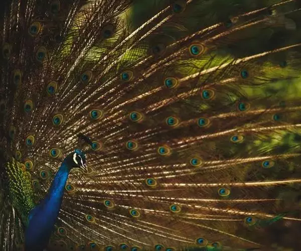 雄鸟头顶耸立一簇冠羽,约长11厘米。冠羽中部辉蓝色而具翠绿色羽缘;前部为鱼鳞状,呈辉亮的蓝绿色,有时具浅蓝紫色光泽。后颈、上背和胸呈金铜色,羽基暗紫蓝色,并具翠绿色狭缘,常部分显露于外,尤以下颈和胸为著。下背和腰翠绿色,具铜褐色矢状羽干纹和黑褐色端缘;初级飞羽和初级覆羽肉桂色,具暗褐色羽端;次级飞羽暗褐色,外翈蓝绿色;内侧覆羽铜褐色,间杂有棕色虫蠹状斑;其余翅上覆羽暗蓝绿色,并富有光泽。尾上覆羽多达100~150枚,并特形延长为尾屏,覆于尾上,羽支分离,绿褐色,具紫铜色光泽;近羽端处有椭圆形眼状斑,斑的中心有暗紫色肾状或圆形小斑,外围以辉亮的蓝绿色;其外又围有一圈宽阔的黄铜色,再围以暗褐色和浅黄色狭缘,最外层为浅葡萄红色,羽端紫铜色,色彩极为艳丽,外侧眼状斑层次不及中央鲜明。最长的尾上覆羽羽支翠绿色,羽端呈同色的菱角形羽片,且无眼状斑;最外侧数枚尾上覆羽亦为翠绿色,内翈羽枝稀疏,外翈羽支较多,且亦分离,至羽端处形成镰刀状羽片,亦不见眼状斑,尾短,隐于尾屏下,呈黑褐色。腹和两胁暗蓝绿色、肛周和尾下覆羽浓褐色,松软如绒状。