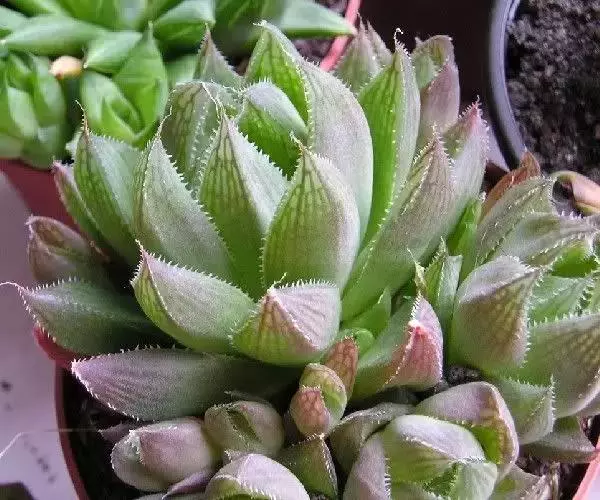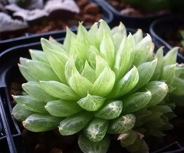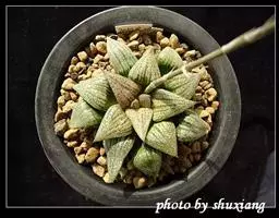 草玉露(学名:Haworthiacymbiformis var.obtusa (Haw.) Baker )隶属于阿福花科、瓦苇属。野外分布于南非开普省南部 。小巧可爱,不会长得很大,却很容易形成群生的姿态。喜光线明亮的生长环境,光线过强时叶片会变成灰棕色,挪至半阴处后可恢复。春秋生长季节,土完全干燥后浇透水。夏季炎热时期须避免暴晒并减少浇水。冬天放在向阳的室内,少浇水多喷雾。