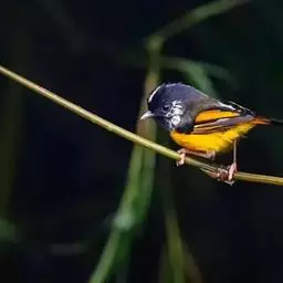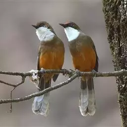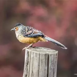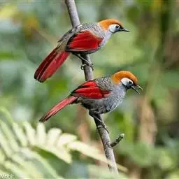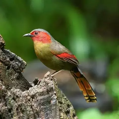 赤尾噪鹛中型鸟类,体长24~28厘米。头顶至后颈红棕色,两翅和尾鲜红色,眼先、眉纹、颊、颏和喉黑色,…