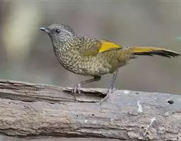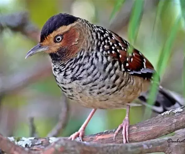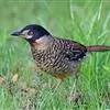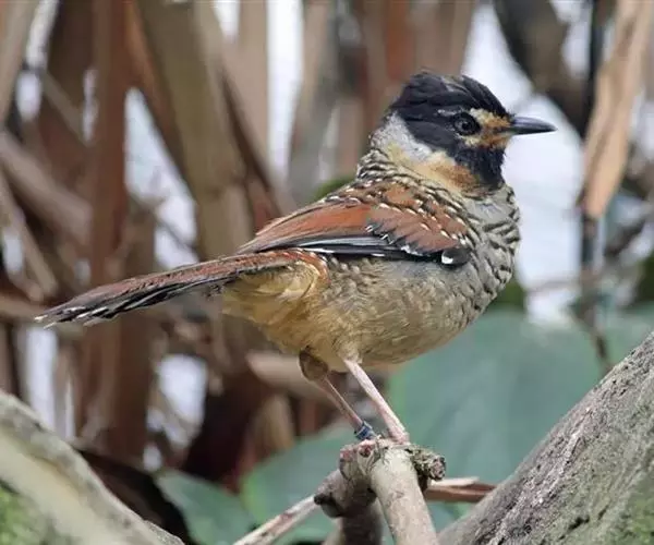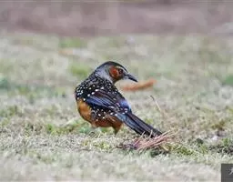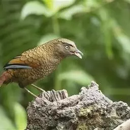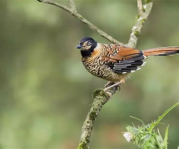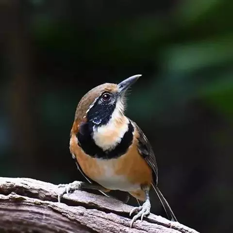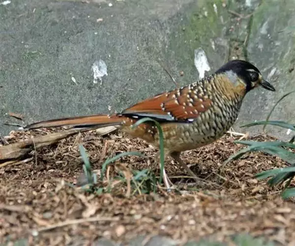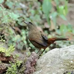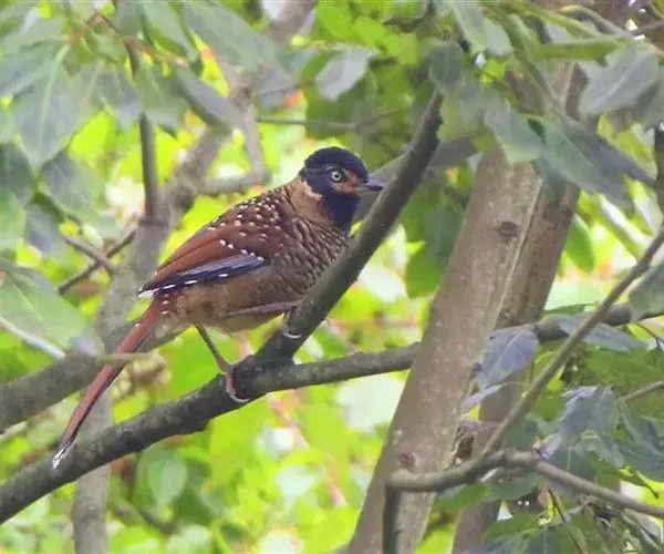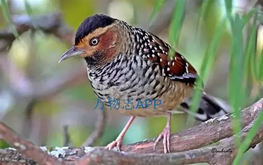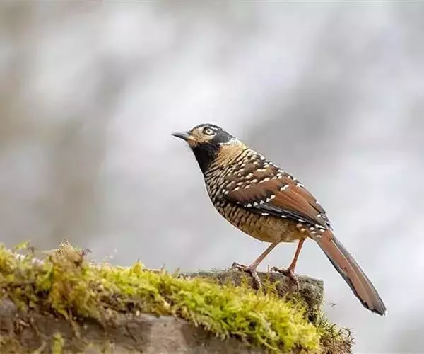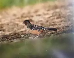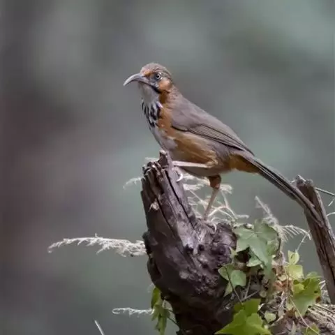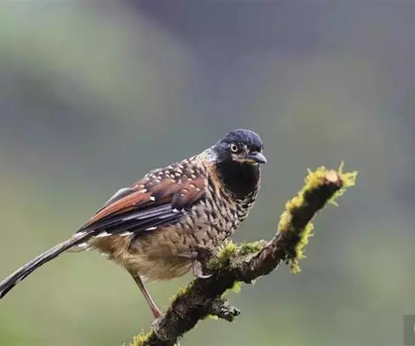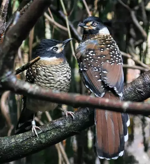 大噪鹛:中型鸟类,体长32-36厘米。额至头顶黑褐色,背栗褐色满杂以白色斑点,…