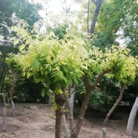 育苗:种子采回后,要及时播种,干藏一个月就丧失发芽力。育苗圃地应选择排水、灌溉条件良好的沙质壤土、黄泥沙土。深耕,使土细,床面平整。条播,播种沟宽5-8厘米,行距20厘米。播后薄覆焦泥灰和细土,以不见种子为准,再盖狼衣草或稻草。每亩播种量1千克左右。约7-10天发芽出土。幼苗生长期要做好松土、除草、间苗、补苗、抗旱等管理工作。迫肥早施,在7月上旬结束。苗木前期生长快,5-7月份苗高生长占全年生长量的72%,根径生长占全年生长量的57%。10约下旬停止生长,12月中、下旬落叶。一年生苗高1米,根径粗1.1米,每亩产苗量1.5-2万株。