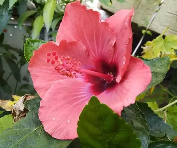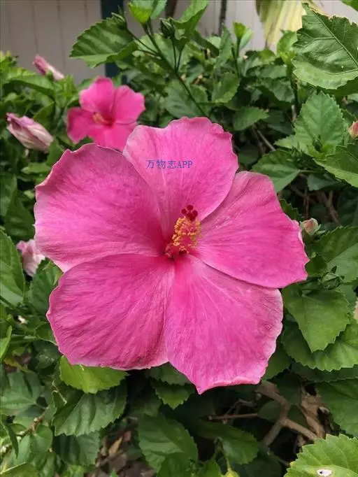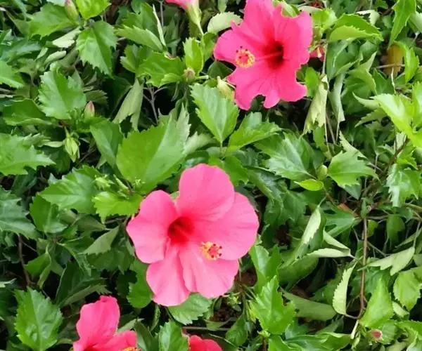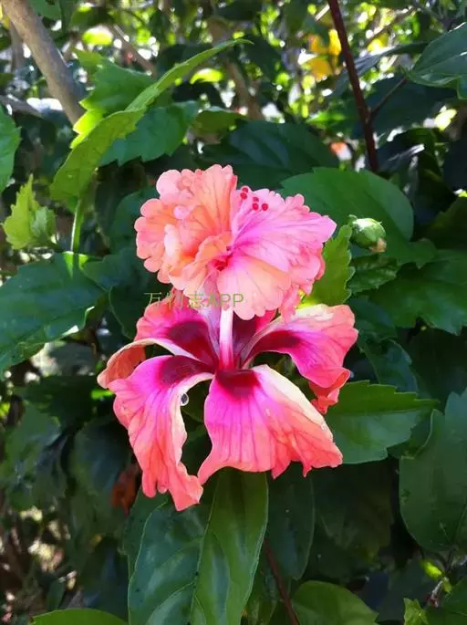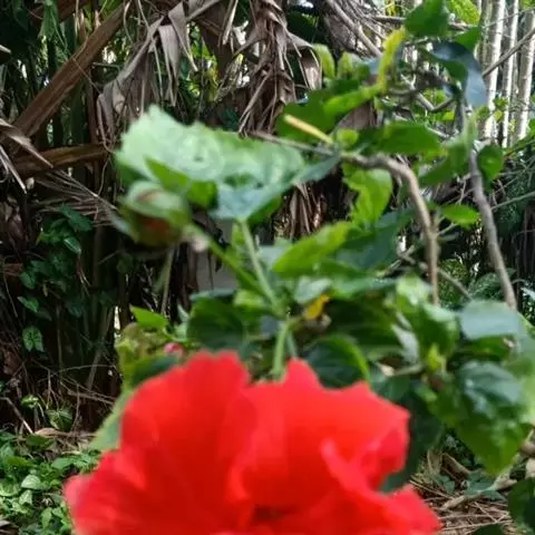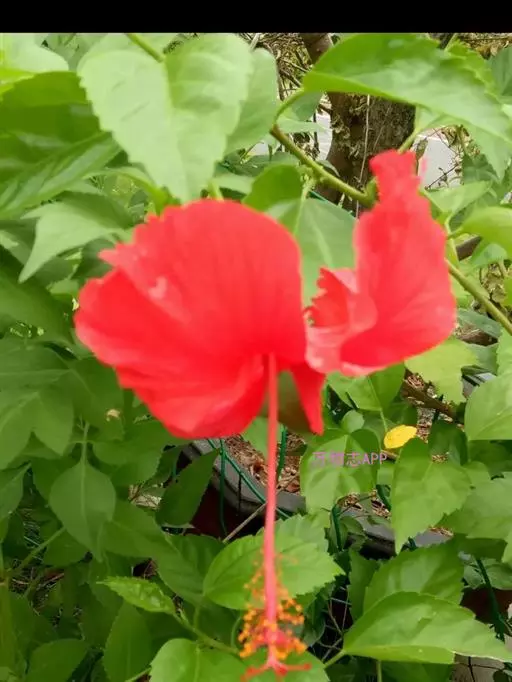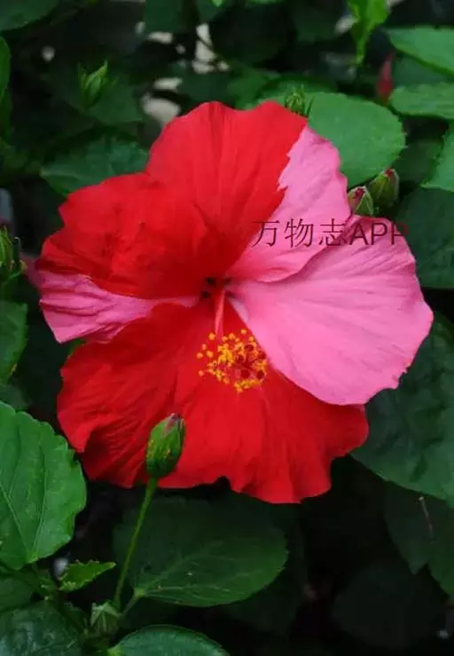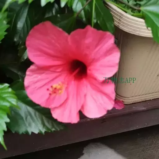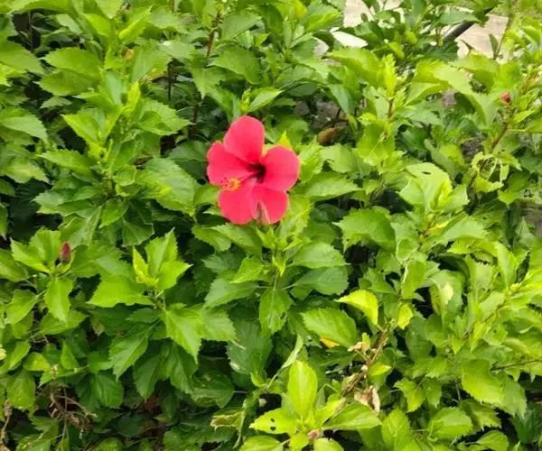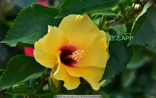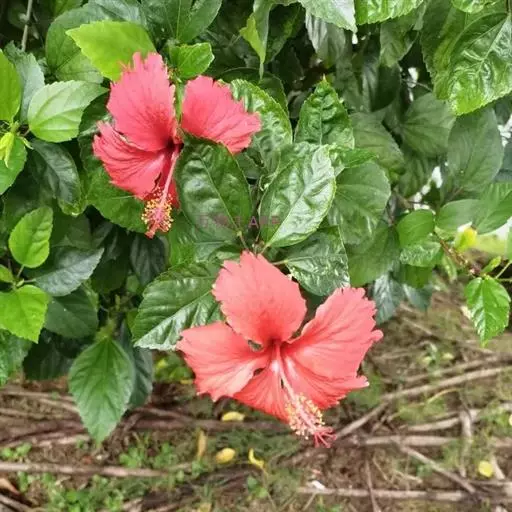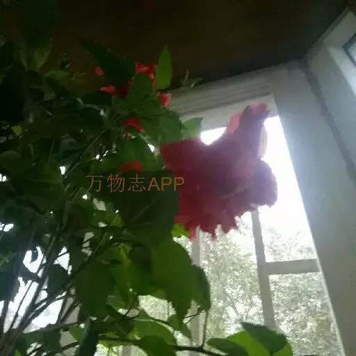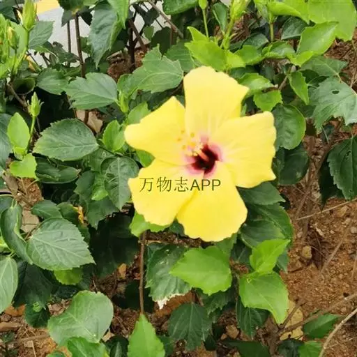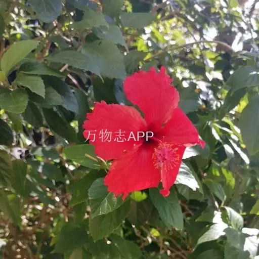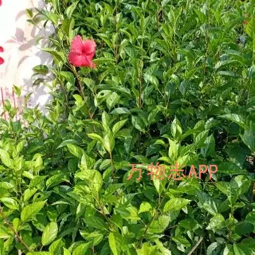 朱槿是常绿灌木,株高约1-3米;小枝圆柱形,疏被星状柔毛。叶阔卵形或狭卵形,长4-9厘米,宽2 5厘米,先端渐尖,基部圆形或楔形,边缘具粗齿或缺刻,两面除背面沿脉上有少许疏毛外均无毛;叶柄长5-20毫米,上面被长柔毛;托叶线形,长5-12毫米,被毛。