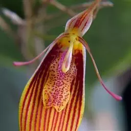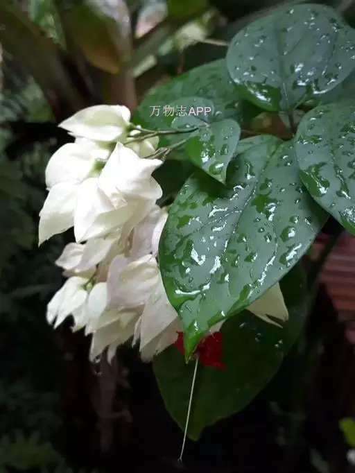 叶狭长,披针形,绿色,具白、粉、红色斑纹。花小,鲜红色。