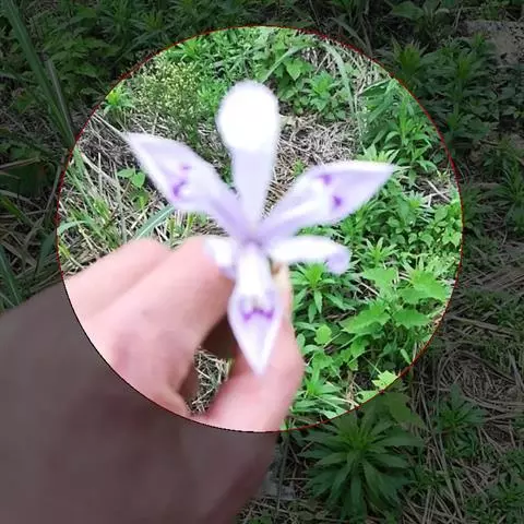 花茎细,长2-4厘米,不伸出或略伸出地面;苞片2 枚,黄绿色,膜质,狭披针形,顶端短渐尖,内包含有1朵花;花蓝紫色,直径3.5-3.8厘米;花梗长约5毫米;花被管长约2厘米,上部逐渐变粗,外花被裂片狭倒卵形,长约3.5厘米,宽约1厘米,有紫褐色及白色的斑纹,爪部楔形,中脉上有黄色须毛状的附属物,内花被裂片倒披针形,长2.5-2.8厘米,宽4-5毫米,顶端微凹,花盛开时略向外倾斜;雄蕊长约1.5厘米;花柱分枝扁平,长约2.3厘米,顶端裂片狭三角形,子房绿色,狭纺锤形,长约1.2厘米。