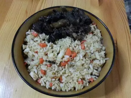 4、把所有炒好的菜,肉,汤和葡萄干,全部倒入电饭锅,把泡好的米饭均匀撒在上面一层,1:2比例为好,开始焖20分钟。