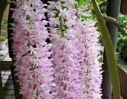 风兰 H.H.Hu):植株高8-10厘米。茎长1-4厘米,稍扁,被叶鞘所包。叶厚革质,狭长圆状镰刀形。…