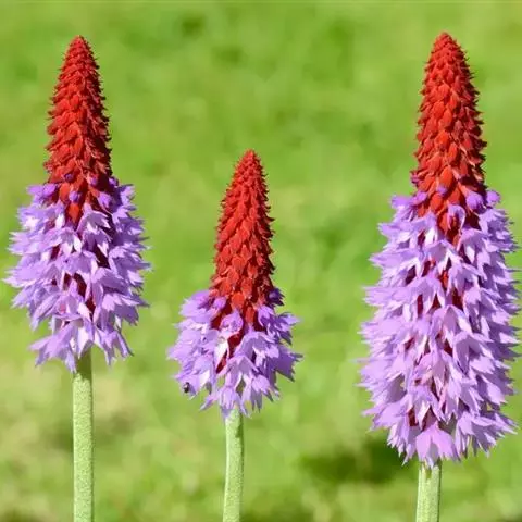 花葶高5-30厘米,果期高可达45厘米,无毛或被短柔毛,无粉或上部被粉;花序近头状,花直立;苞片多数,披针形,长5-10毫米,先端钝或稍渐尖,基部稍膨大并常被粉,边缘互相覆盖;花梗极短或有时长达5毫米;花萼狭钟状,长5-10毫米,被粉或粉质腺体,分裂达中部或更深,裂片窄长圆状披针形,常染紫色,先端钝或锐尖,边缘具短缘毛;花冠蓝紫色或紫红色,极少白色,冠筒口周围黄色,冠筒长8-12毫米,冠檐直径1-2厘米,裂片倒卵形,先端2深裂;长花柱花:雄蕊着生处距冠筒基部约3毫米,花柱长6-7毫米:短花柱花:雄蕊距冠筒基部约6毫米着生,花柱长1. 5-2毫米。蒴果近球形,短于花萼。花期4-6月。