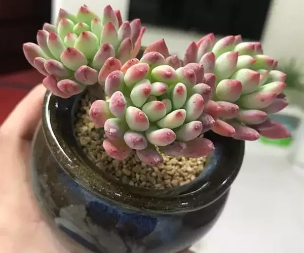 蓝苹果多肉夏季叶端的红色容易变淡,甚至完全退掉,基本呈蓝绿色状态。花期春季,聚伞花序,花开5瓣,五角星形,柠檬黄色。