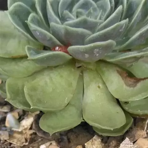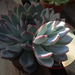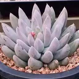 蓝苹果多肉植株常呈莲座状株型,易从茎的下部长出新枝,形成群生态,渐变成老桩。叶片,匙形,轮生,莲座状排列,肉质饱满,略显扁平,叶背有些凸起,有龙骨线,叶面平,或微微内凹,叶端稍收窄、收尖,叶色较为丰富,随季节、温差的变化而变化,有蓝绿色、紫色、漂亮的果冻色等,叶端有桃红色、粉红色、或是玫瑰红色的色晕,老叶的叶面、叶背有大面积的红晕,出状态时红得更加浓烈、更加令人陶醉,叶面被有白粉。