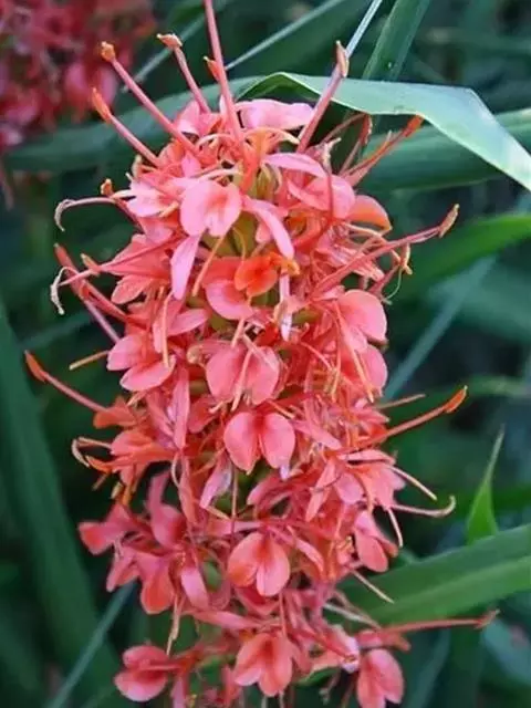 红姜花,姜科,姜花属多年生草本植物,高可达2m。叶片狭线形,穗状花序多较稠密,圆柱形,花红色。…