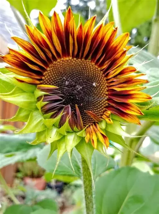 杆高1米。具令人叹为观止的棕色中心为15厘米的葵花,栗红色,花尖呈黄色,中间有一点黄色。每年产约40粒种子/克。对传粉者特别有吸引力。