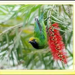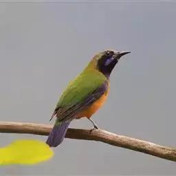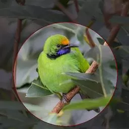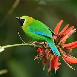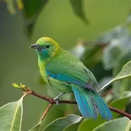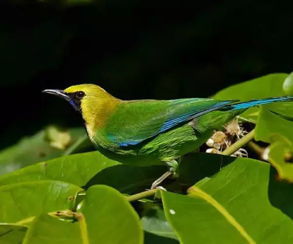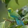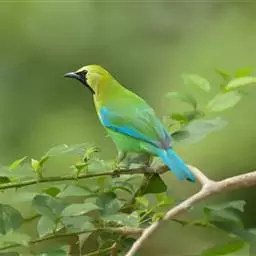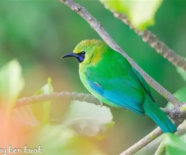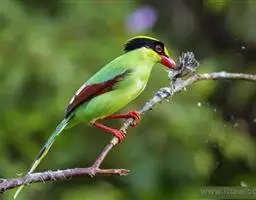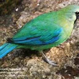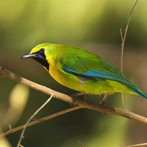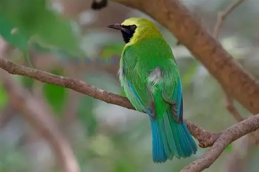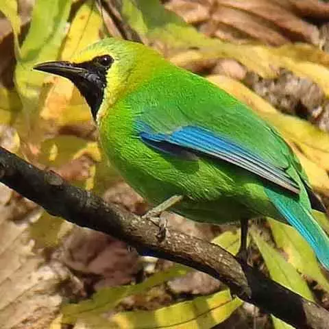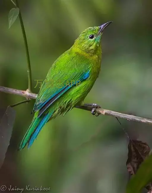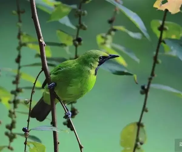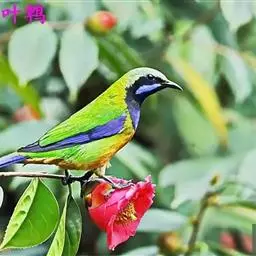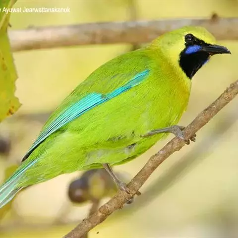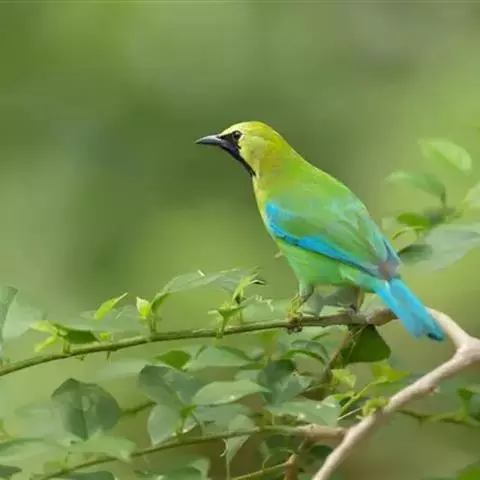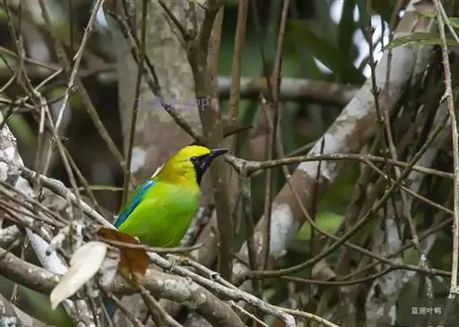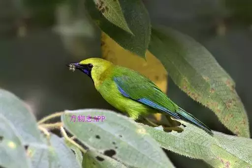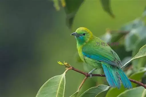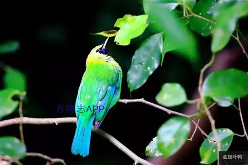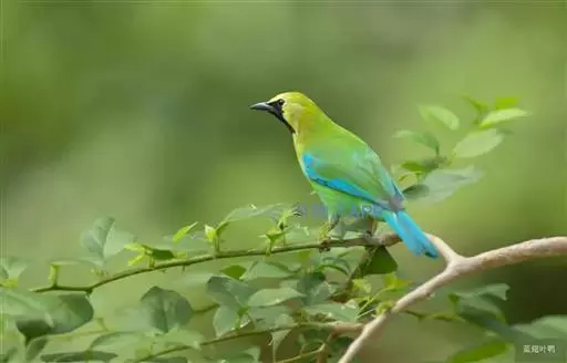 蓝翅叶鹎:小型鸟类,体长15-18厘米。雄鸟通体草绿色,尾蓝绿色,肩和翅亮蓝 色,胸缀有黄色,…