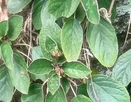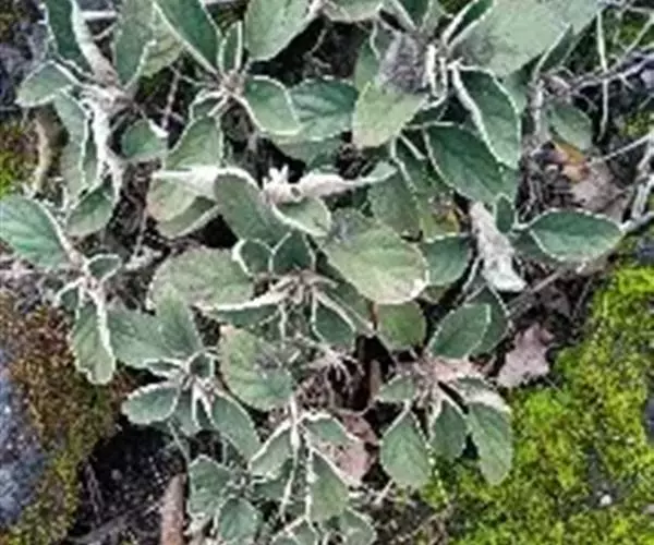 叶对生,密集于茎近顶端,具叶柄;叶片长圆形或狭椭圆形,长3-12厘米,宽2-5.5厘米,顶端钝,基部圆形,边缘密生小钝齿,上面密被短糙伏毛,下面和叶柄密被锈色或灰色毡毛,侧脉每边5-6对,上面不明显,下面隆起;叶柄长1.5-7厘米。