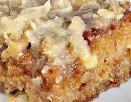 2. 将面包切去外壳,然后切方丁(烘或炸干更佳),放入盆内加去了皮籽并且成丁的苹果,拌匀后,装入铺有糖底的 模具内。