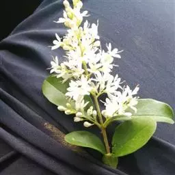 圆锥花序顶生,长4~9厘米,宽5~8厘米,总花梗纤细,长2~4厘米;苞片和小苞片迟落或宿存而显著,条状披针形,绿白色;花芳香,生于序轴的第二至第三级分枝上;萼筒筒状至倒圆锥筒状,长约2毫米,萼檐波状或具宽三角形的齿,长约1毫米;花冠白色,辐状,直径约6毫米,筒长约1毫米,裂片卵圆形,长约2毫米;雄蕊与花冠裂片等长或略超出,花药黄白色,矩圆形;花柱与萼齿几等长,柱头头状。