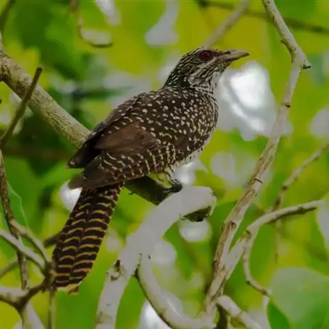 斑翅凤头鹃: 成鸟具羽冠,上体及头侧、翅、尾等黑色,具铁绿色亮辉,尾羽端部具白斑,两侧者形宽,…