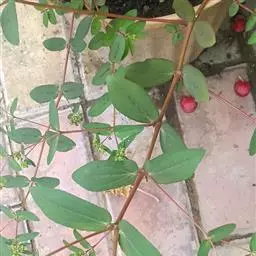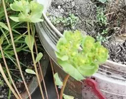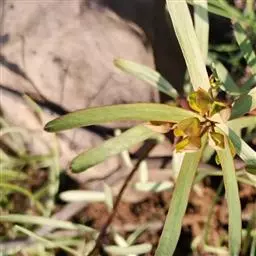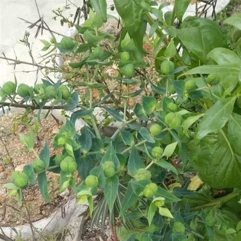 花为杯状聚伞花序生于枝顶或节上有短总花梗,总包陀螺状,直径约0.2厘米,具有5枚腺体,内披柔毛,花冠5瓣,黄白色,花无花被,雄花小数,雌花具多数总苞,苞片细小。