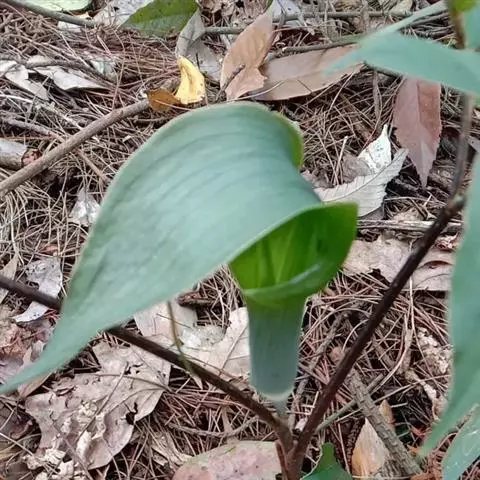 花序柄短于叶柄,有时长为叶柄的1/2。佛焰苞管部绿色,宽倒圆锥形,长3.6-4厘米,上部粗1.8-2厘米,喉部多少具宽耳,耳内面深紫,外卷;檐部下弯成盔状,前檐具卵形唇片,下垂,先端外弯。肉穗花序单性,雄花序无柄,圆柱形,长1.5厘米,粗8毫米,雄花规则地螺旋状排列,每花花药2,具短柄,2室,药室短卵圆形,顶孔横裂;雌花序近球形,长宽1.5厘米,子房卵圆形,顶部渐狭,胚珠1。