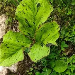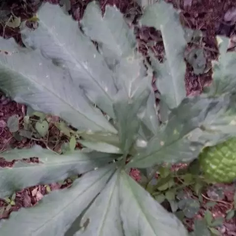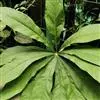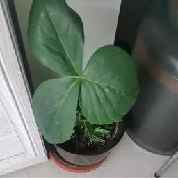 块茎扁球形,具小球茎。鳞片向上渐狭,内面的长约12厘米。叶2(-1),叶柄长15-30厘米,粗7-8毫米,下部1/3具鞘,鞘管状,口部截形;叶片3全裂,裂片无柄或具短柄,中裂片宽椭圆形,长16-23厘米;侧裂片偏斜,长圆形或椭圆形,长15-18厘米,宽均在10厘米以上,先端渐尖,具长1-1.5厘米的锥状突尖,侧脉脉距约1厘米,集合脉距边缘5毫米。