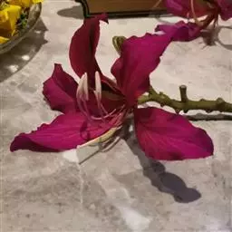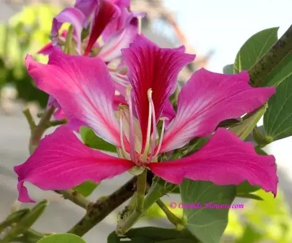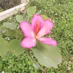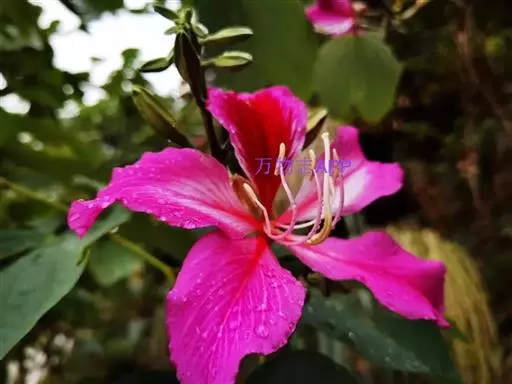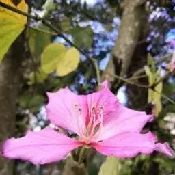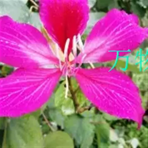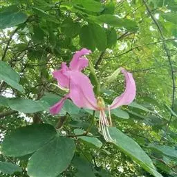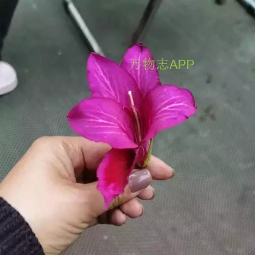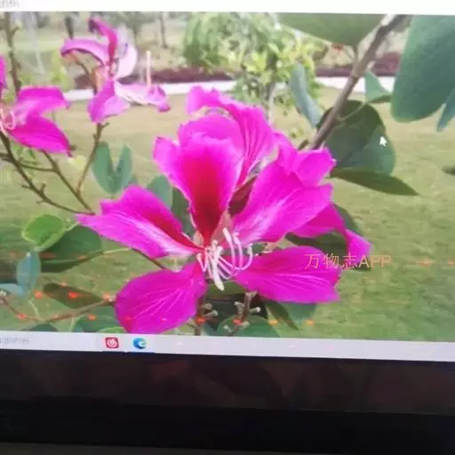 红花羊蹄甲(学名:Bauhinia blakeana Dunn):常绿乔木,树高6-10米。叶革质,圆形或阔心形,长10-13厘米,宽略超过长,顶端二裂,状如羊蹄,裂片约为全长的1/3,裂片端圆钝。 总状花序或有时分枝而呈圆锥花序状;红色或红紫色;花大如掌,10-12厘米;花瓣5,其中4瓣分列两侧,两两相对,而另一瓣则翘首于上方,形如兰花状;花香,有近似兰花的清香,故又被称为“兰花树”。花期十一月至翌年四月。花大如掌,略带芳香,五片花瓣均匀地轮生排列,红色或粉红色,十分美观。