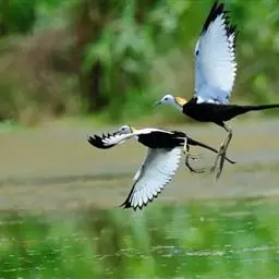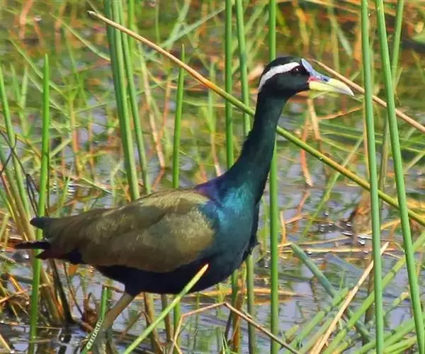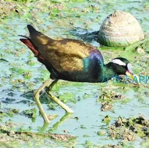 铜翅水雉(学名:Metopidius indicus):是小型涉禽,体长28-31厘米。头颈、下体黑色,具金属色辉。从眼到颈有白色纵纹,背、内侧初级一飞羽橄榄铜绿色,尾下覆羽栗色。跗蹠的前后均有盾状鳞,趾、爪均甚长,后爪特别长。栖息于热带开阔的田坝区,单个或成对在沼泽湿地中活动觅食。捕食昆虫、蜗牛、小鱼和水生植物。配偶为一雌多雄制,雌鸟常常拥有很多个雄鸟。雄鸟的领域性极强,常常为保卫领域而彼此争斗。7-8月产卵,巢用杂草铺垫而成,每窝产卵4枚。