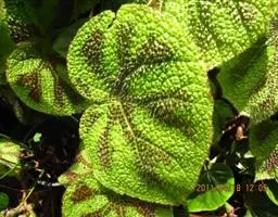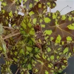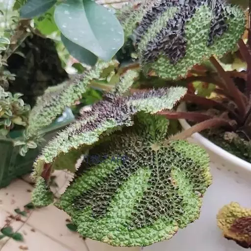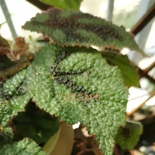 真菌病害,由葡萄孢菌引起的灰霉病症状:秋海棠叶片灰霉病经常发植株的下部,尤其是根茎处与基质接触的地方更容易感染病菌,被水浸润的病斑很快会扩散到整个叶整个植株,受害区域呈现坏死斑点,逐渐由褐色转变为黑色。当夜间温度较低、白天温度较高而且湿高时,病原孢子生长加快,受害的叶片上会长出灰绿色的霉状物。