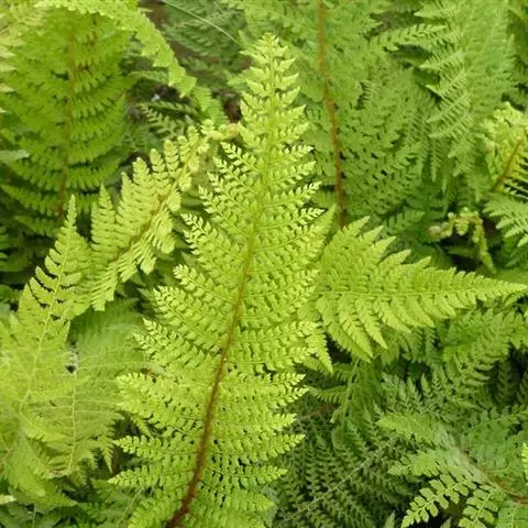 植株高约2米。根状茎长而横走,粗壮,粗达5毫米,密被栗褐色鳞片;鳞片质厚光泽,披针形,先端往往扭曲。叶大,疏生;柄长约1米,基部粗达5毫米,圆形,红色,有光泽,基部具微细疣状突起而略粗糙,向上平滑;叶片三角形或长圆状三角长50-100厘米,二至三回羽状;羽片对生,平展或斜展,或上部的旱镰刀形而斜向无柄,基部有托叶状的小羽片1对,基部一对羽片通常较大,一般中型植株的基部羽片25-45厘米,宽13-30厘米,长三角形,先端尖,基部截形,一回羽状或二回深羽裂;羽片多数,对生,平展,无柄,下部1-3对较大,或第二、第三对较大而基部一对略缩长10-15厘米,宽3-4厘米,披针形或长圆披针形,长尾头(尾长2.5-4厘米),截形至阔楔形,一回羽状或深羽裂达小羽轴;裂片6-9对,对生,平展或略斜展,通常二对较大,长约1.5-4厘米,宽5-8毫米,长圆形或长圆披针形,钝头或短渐尖,基部小羽轴多少合生,两侧略膨大,下侧多少下延,有狭翅相连或彼此远分离而小羽轴无翅,间隔与裂片等宽或较宽,全缘或羽裂达1/2,边缘波状或具波状圆齿;第二对距基部一对10厘米以上,和基部一对同形,向上各对羽片均略变小。叶脉网状,网眼角形或六角形,沿主脉及小羽轴两侧的1列网眼较长而整齐,向叶边的较小,两面显。叶干后草质或纸质,上面褐绿色,下面灰绿色或浅灰色,均无毛;叶轴及各回羽由栗红色渐变为棕禾秆色以至禾秆色,有光泽,无毛,上面有浅纵沟。
