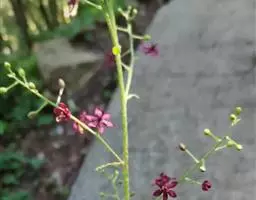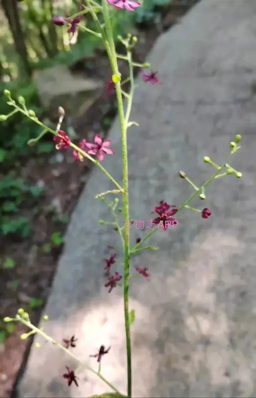 圆锥花序通常疏生较短的侧生花序,最下面的侧生花序偶尔再次分枝;总轴和枝轴密生绵状毛;花多数,疏生;花被片黑紫色,开展或反折,近倒卵状矩圆形,通常长5-7毫米,宽2-3毫米,先端钝,基部无柄,全缘;花梗长约为花被片的2倍,长可达1厘米或更长,在侧生花序上的花梗比顶生花序上的花梗短;小苞片长3-4毫米,背面和边缘生毛;雄蕊长约为花被片的一半;子房无毛。