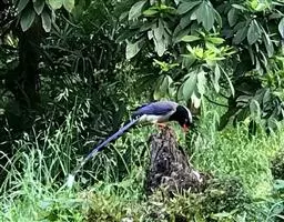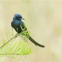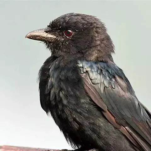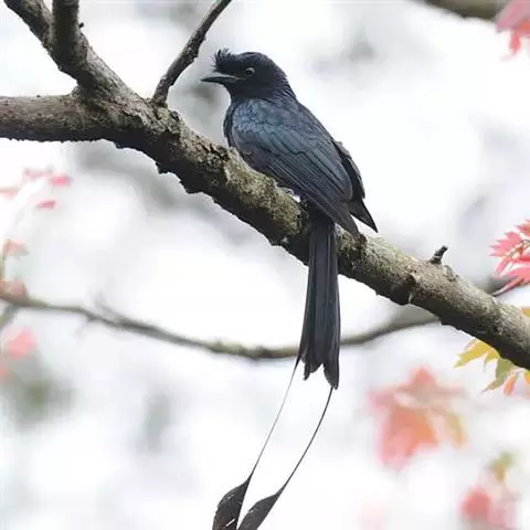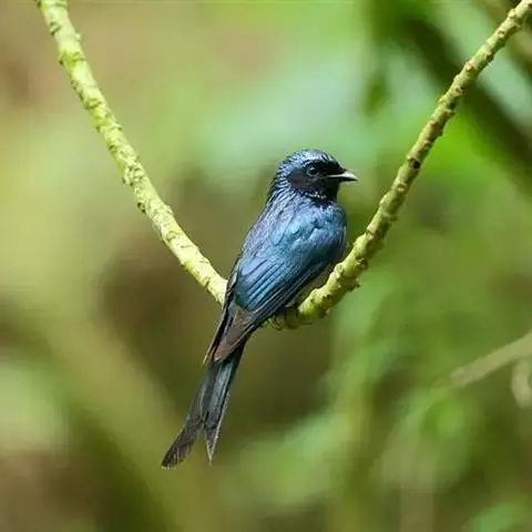 发冠卷尾是中型鸟类,体长28-35厘米。通体绒黑色缀蓝绿色金属光泽,额部具发丝状羽冠,…