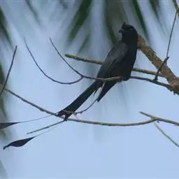 冠卷尾酷似黑卷尾,但体型较粗大,外侧尾羽显著向上弯曲,额头上有十余条发状羽,…