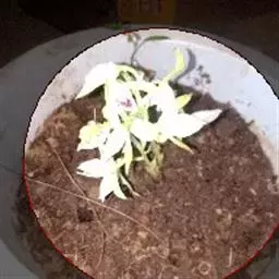 方法一 准备好兰盆及植料后,将兰株倒拿(根在上,叶在下)放于水龙头下以慢水冲洗,但水压切忌过强,以免伤兰根及叶子。用拇指和食指抓住兰头,小指抵住盆缘,用竹筷将根固定,当放入盆内时,尽量不要让根接触到盆壁。将豆粒大的混合石砾倒入盆底至三分之一处。然后倒入中粒植料至五分之四处,填实和尽量不要留下空间。将竹筷拔出,并摇实盆中植料。填实植料后,再用大粒植料埴入至距盆缘1.5厘米处。最后再倒入豆粒大植料,以将假鳞茎全部埋入土中为度,然后充分摇实。用压土工具轻压植料,并将表面弄平。种植完毕后,植料在盆中以中央稍高为好。