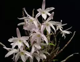 花葶从假鳞茎侧面发出,直立,长20-30厘米,中下部有2-3枚筒状鞘;总状花序通常多少缩短,长2-6厘米,具较密集的花;花苞片卵状披针形,长3-5毫米;花梗和子房长7-12毫米;花10余朵或更多,通常白色并有紫纹;萼片长圆状披针形,长9-11毫米,宽2.5-3.5毫米,先端渐尖;侧萼片斜歪并略宽于中萼片。